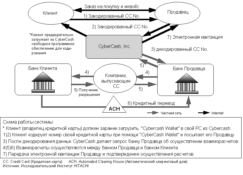 В марте 1995 г. компания CyberCash стала предлагать услуги службы Credit Card Service, которая представляет собой систему оплаты кредитной картой по сети Интернет (Рис. 1).